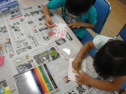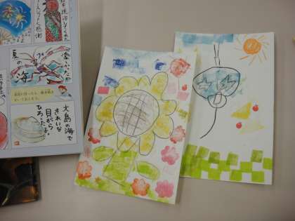7月1日(金)、2日(土)に図書館を開館しました。午前中、読み聞かせの後、消しゴムスタンプを使って、絵手紙をかこうという工作イベントを行いました。昨日に続いて保護者の方の参加も多く、カラフルな色のスタンプ台を使い、親子で一緒に絵手紙作りに挑戦していました。できあがった作品を見せ合ってとてもうれしそうでした。今月は、16日土曜日も絵手紙を作るイベントを行う予定です。図書館に来て、夏のお便りを作ってみてください。