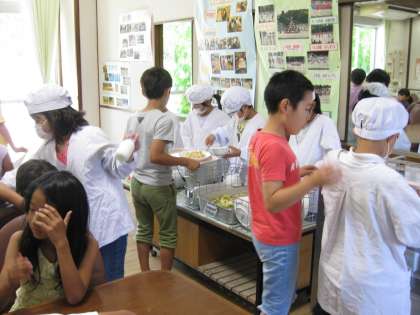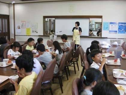 今日はランチルーム給食を行いました。今日は七夕ということで、七夕献立でした。デザートはスイカでしたが、ランチルーム給食のため、サクランボも付いてみんな大喜びでした。栄養士の石川さんからは食器の使い方や、食器の置き方についてお話がありました。ご飯や麺は左側、おかずは右側、と教えてもらって話を聞きながらお皿の置き方を直している児童もいました。また、食べる時の姿勢についても話してくださいました。みんな姿勢や食器の持ち方を意識して、楽しくおいしく食事ができました。