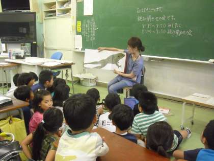 紙芝居や動物の実物大の大きさが分かる絵本などを読んでもらい、楽しみました。子どもたちは本の魅力にひきこまれていました。