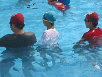 5・6時間目に、6年生は、学年全体の「着衣泳」に参加しました。講師の先生のお話をよく聞いてから、服を着て水の中に入りました。浮き方や回転、逆立ちなどの動きを体験し、「もしも!」の時に自分で命を守る行動がとれるように教えていただきました。ライフジャケットを身に付けて浮かぶ感覚も体験しました。