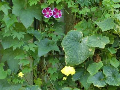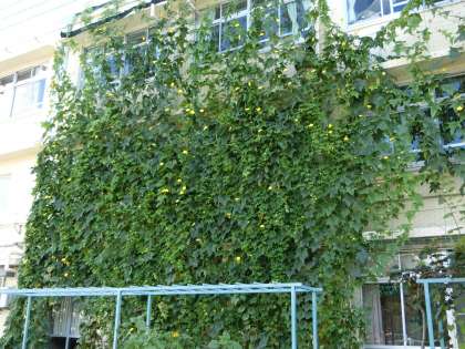 学校の校舎壁面に沿って張られているグリーンカーテン。ヘチマの花や朝顔の花が今朝もたくさん咲いています。屋上近くまで成長しているヘチマの茎も見られます。所々にヘチマの実が育っている様子も見られます。