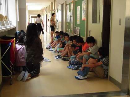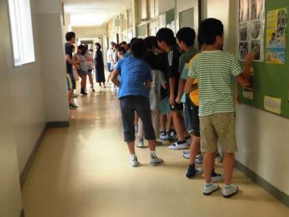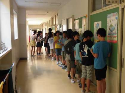 分かりにくいのですが、写真は保健室前で事前健診を待つ6年生の様子です。