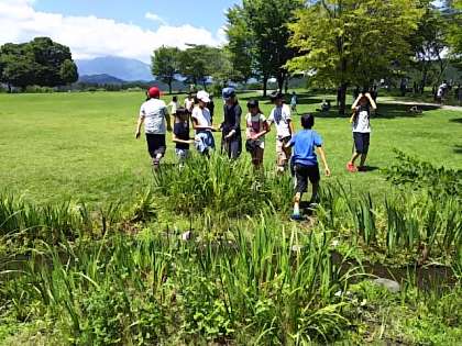 昼食のあと、園内を流れる川で生き物を探したり、とんぼを追いかけたり、園内を走ったりと、楽しく過ごしています。