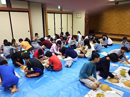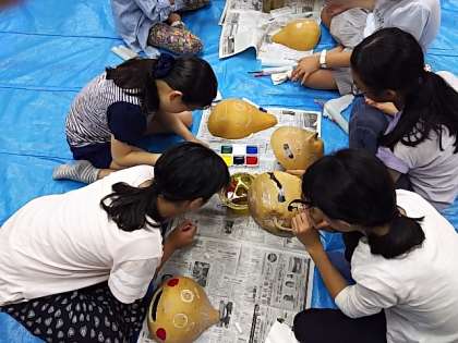 チョークでデザインし、講師に穴を開けていただき、絵の具で着色です。素材の形を生かした個性的な作品となりそうです。