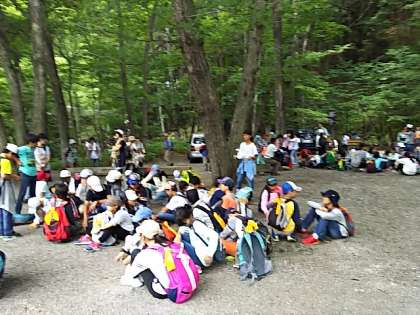 予定より少し早く、昼食場所の湯滝に着きました。途中、逆コースの世田谷区立小学校4校と、戦場が原の木道で出会い、元気よくあいさつを交わしていました。お腹がすいて、やや疲れも感じている子どもたちです。
