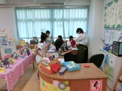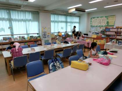 高学年の子どもたちが、司書さんの仕事を手伝い“ミニ司書さん”として連日活躍しています。また、低学年の子どもたちが楽しく泳いだあとで、本を読んだり、借りたりしていました。