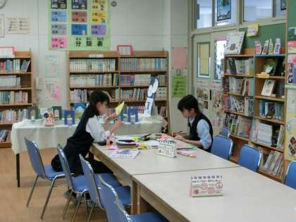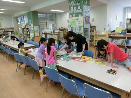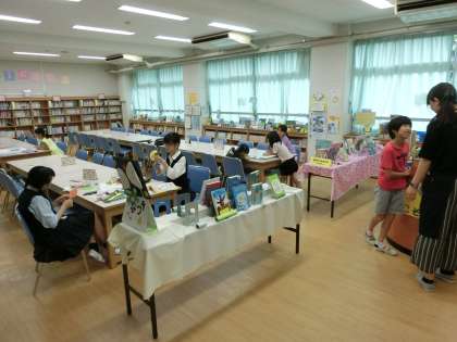 雨天のため、水泳教室は中止となりましたが、学校図書館は子どもたちの利用が続いています。
