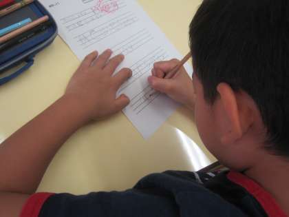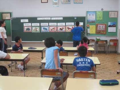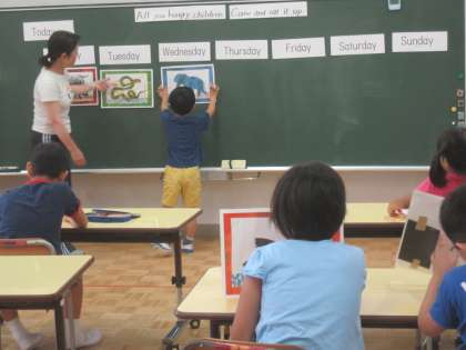 5時間目に、英語の学習をしました。「月曜日は何食べる?」という絵本から絵や言葉を引用して、曜日の言い方を学習しました。絵本に沿った歌をみんなで歌いながら、順番に絵カードを黒板に貼っていきました。さらに、手本をよく見ながら、「Monday」「Tuesday」等の単語を書く練習もしました。最後に、英語の手遊び歌に合わせて元気よく、そして楽しく体を動かしました。英語に親しむというめあてを達成し、子どもたちの笑顔が見られました。