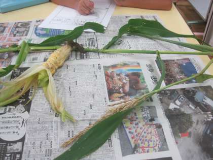 3・4時間目の生活単元学習で、つくしの学級園に行き、「トウモロコシ」と「サトイモ」を観察しました。トウモロコシは、実ができていましたが、大雨や風のために倒れてしまっていたので、全部抜いてきました。サトイモは、土の中の芋が大きくなるまで、もう少し時間が必要な様子でした。抜いてきたトウモロコシをみんなでよく見て、観察カードに記録しました。余程、おいしいトウモロコシだったのでしょうか?ほとんどが、虫に食べられてしまっていたり、虫がついていたりしました。倒れていたため、雨水がしみこんでしまった物や逆に乾燥しすぎている物、粒がまばらな物もあり、少し残念そうな子どもたちでした。「(もう少し)水をあげれば、きれいなトウモロコシができると思います。」と感想を書いている子もいました。