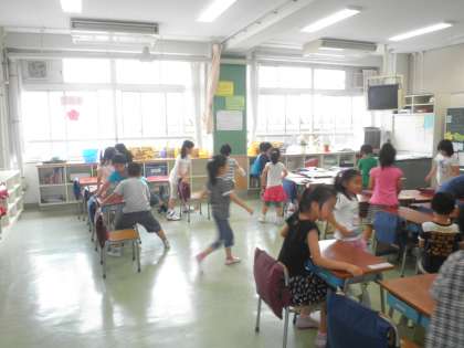掃き掃除、雑巾がけ、一年生だって机を協力して運んでいます。
