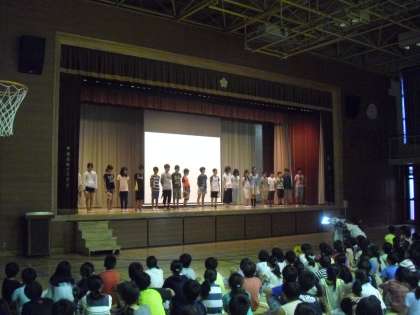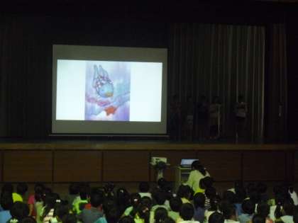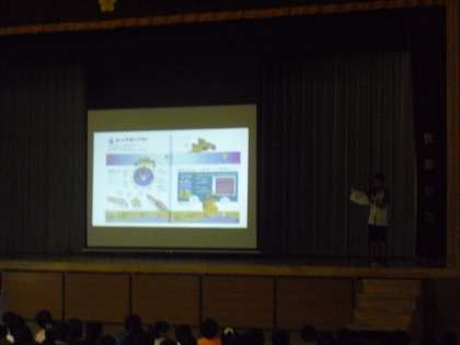 今日は児童集会の時間に、図書委員会による発表が行われました。