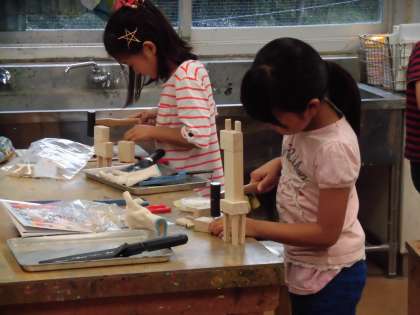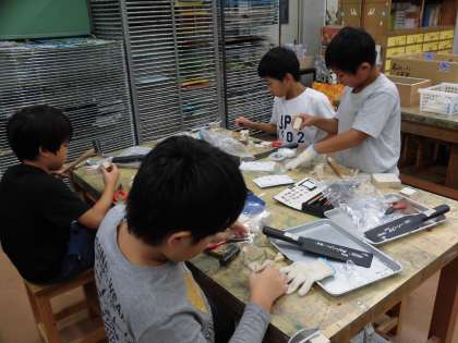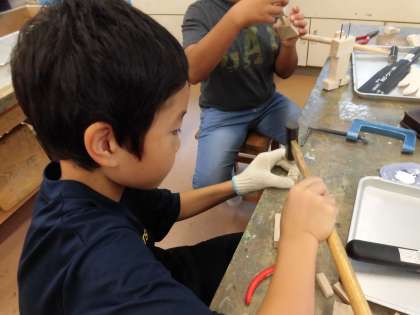 子どもたち全員が作業に集中していて、のこぎりで木を切る音、トンカチで釘を叩く音だけが響き渡る、まるで職人さんのいる工房のような図工室でした。