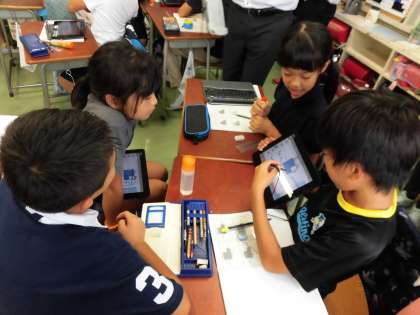 子どもたちは、タブレット端末に配信されたワークシートに面積の求め方をタッチペンでどんどん書き込んでいきました。隣の席の友達やグループでの交流を通して、「こんな考え方もあったのか!」と驚きの声をあげている子もいました。
