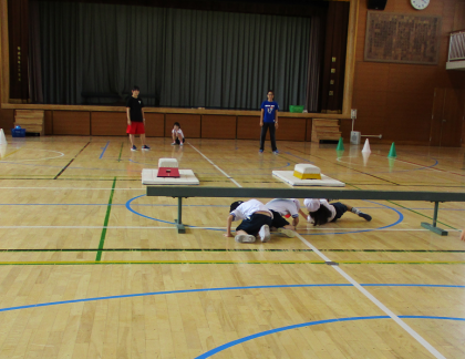 1時間目に体育館で体育をしました。始めに準備運動としてストレッチをしました。次に全員でダンスの練習をしてから、低学年と高学年に分かれて、種目別の練習をしました。低学年は、「平均台をなるべく速く、くぐりぬけること」をめあてに頑張りました。高学年は、「ボールシュートを確実にできること」をめあてに繰り返し練習しました。