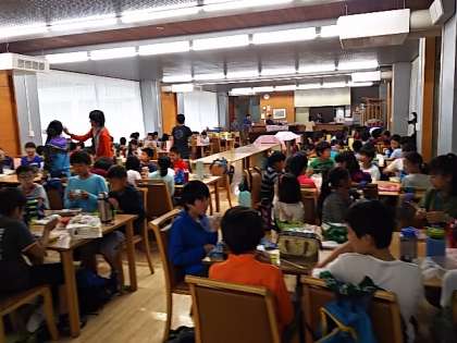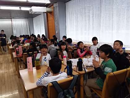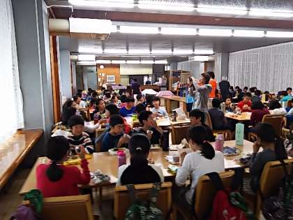 待ちに待ったお弁当タイムです。小雨の模様のため、食堂をお借りして食べています。朝が早かっただけに、笑顔いっぱいの子どもたちです。