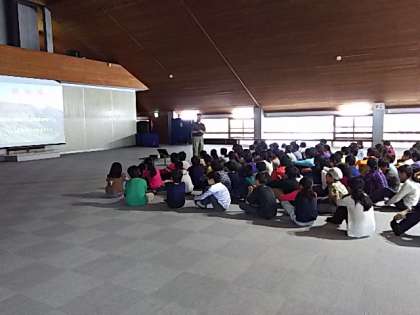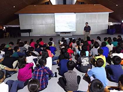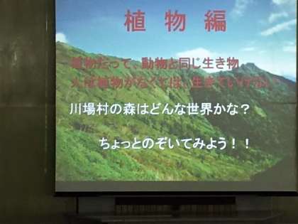 現在、村の会堂で、川場村についての説明を受け、自然や動植物について学ぶ里山入門の学習中です。