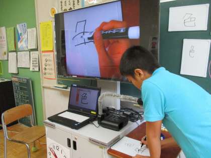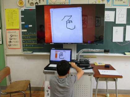 4時間目の国語グループ学習で、漢字の学習をしました。9枚のパネルに隠れている漢字を当てる「漢字めくり」の学習にみんなで取り組みました。今日は、自分のノートに書くだけではなく、ホワイトボードにも書いて、発表し合いました。お手本の漢字と比べて、形よく書けているか、気付いたことを伝え合いました。