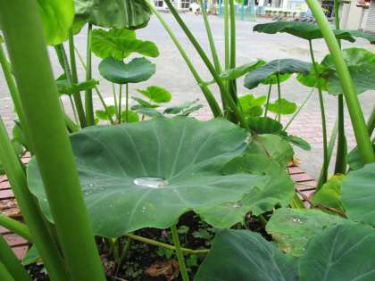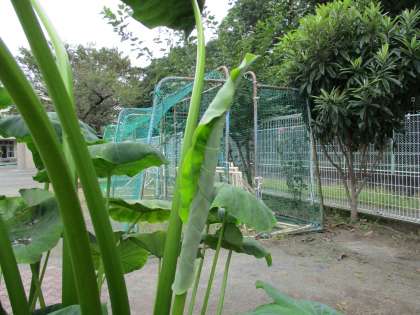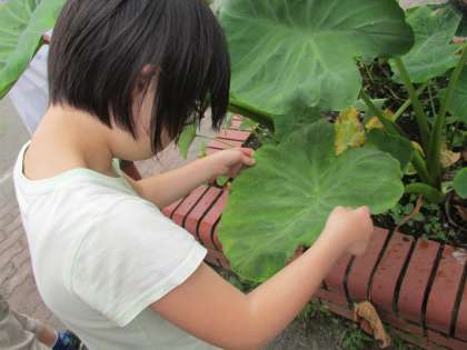 写真は、「サトイモの観察」の様子です。大きな葉っぱの上に、降り始めた雨水が丸くなってのっていました。虫除けのネットが、大きな葉っぱには少し窮屈そうだったので、はずしました。すると、くるくる丸まった細長い葉っぱがあることを発見しました。教室に戻って、見たこと・気付いたことを観察カードに記録しました。