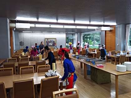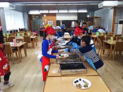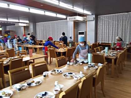 食堂では、食事係が、朝食の準備を進めています。補助員さんから説明を受け、手際よく配膳しています。