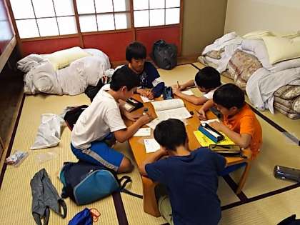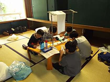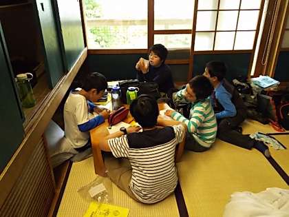 入浴までの時間を活用して、葉書を書いています。楽しかったハイキング、おいしかったますの塩焼き、そしてみんなで食べたお弁当など、ここまでの話題や感想を思い思いに書いています。川場村からご家族に届く葉書をお楽しみに!