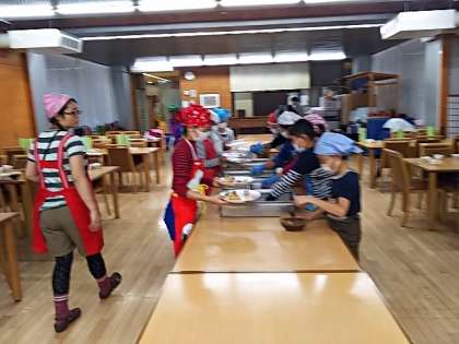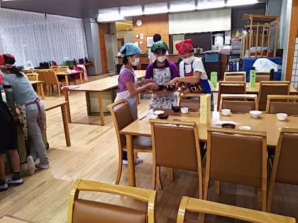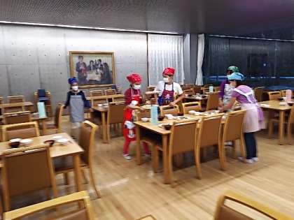 5時半からの夕食の時間に向けて、食事係が配膳を進めています。朝食に続き2回目。手際よく準備が進んでいます。