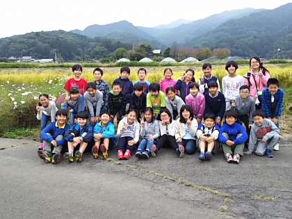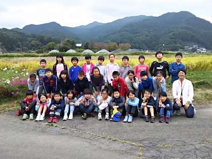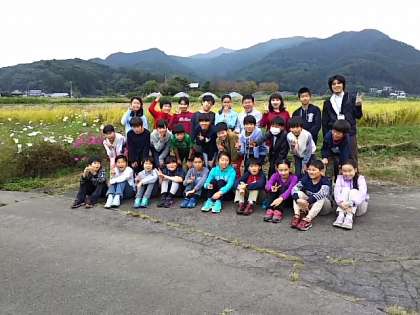 田園の真ん中で、記念撮影もしました。金色に輝く稲穂、収穫を終えた田畑、色づき始めた野山。心に残る一こまです。