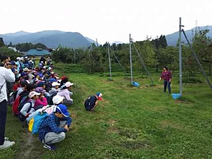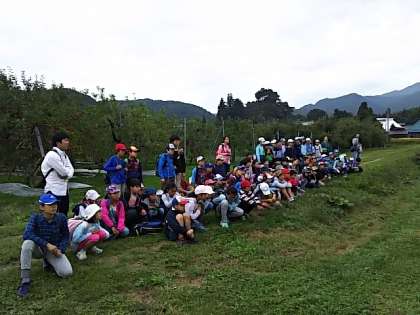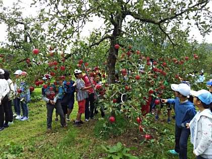 りんご畑に案内していただき、もぎ方のアドバイスを受け、一人一個のりんごもぎ体験をしました。