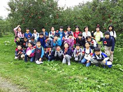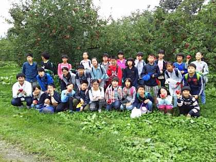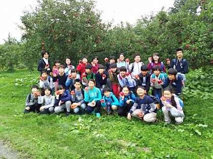 りんご畑をバックに記念撮影です!