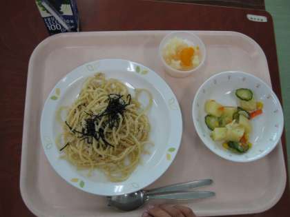 今日はリクエスト給食でした。1学期に保健給食委員会のみなさんがアンケートをとって集計した結果、メニューはたらこスパゲティ、ポテト入りフレンチサラダ、カルピスゼリー、グレープジュースに決まりました。みんな朝から楽しみにしており、それぞれの学級でお代わりじゃんけんが白熱していました。みんなでおいしくいただきました。