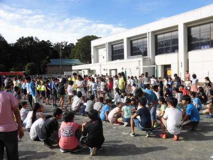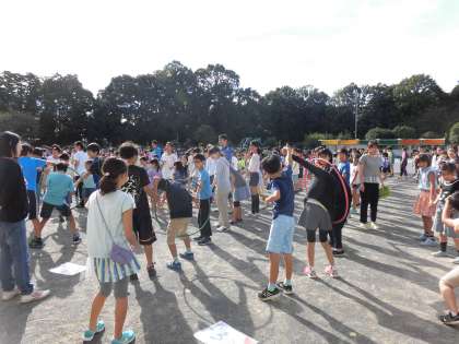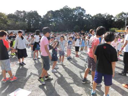 児童集会では「プラフープリレー」を行いました。縦割り班のメンバーで手をつなぎ、その手を離さないようにしながら先頭の子から最後尾の子までフラフープを送っていきます。お互いに声をかけ合いながら、上手にフラフープの中に体を通していました。