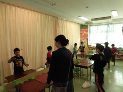 今日はキッズフェスティバルでした。これまで準備を頑張ってきて、みんなとても楽しみにしているようでした。キッズフェスティバルが始まって、お客さんを呼ぶために大きな声で宣伝をしたり、お客さんの対戦相手になったりと、それぞれのお店でよく頑張っていました。お客さんもたくさん来てくれて、とてもうれしそうでした。4時間目は振り返りをしましたが、それぞれによく頑張り、他の学年のお店も楽しめたようです。満足そうな表情が印象的でした。