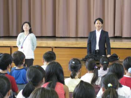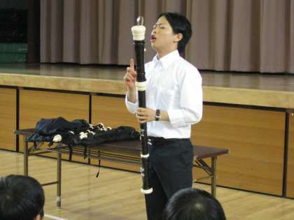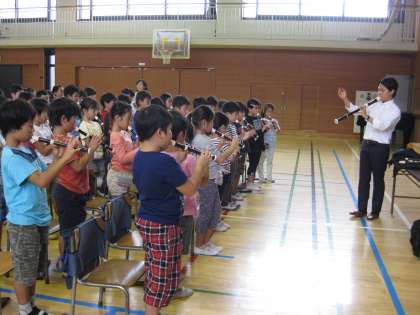 今日の2校時に体育館でリコーダー講習会を行いました。講師として、東京リコーダー協会の増永先生が来てくださいました。リコーダーで「アナと雪の女王」や「千と千尋の神隠し」等、様々な曲を吹いてくださり、そのきれいな音色にみんなとても驚いていました。タンギングや息の吐き方のポイントを分かりやすく教えてくださり、みんなでリコーダー奏を行いました。たくさん褒めていただき、うれしそうでした。また、様々なリコーダーを紹介してくださり、初めて見るバスリコーダー等に驚いていました。リコーダーの上手な吹き方を教えていただいたので、今後の音楽の学習で生かしていきたいと思います。