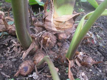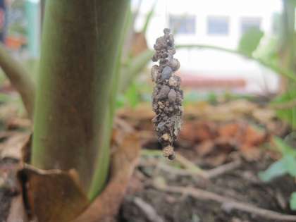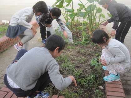 1時間目の終わりに、学級園のサトイモを観察しに行きました。大きく育った葉が枯れ始め、根元を見ると、親イモの周りに、子イモが育っていました。もうすぐ、収穫の時期を迎えます。観察をしていると、サトイモの葉に小さな蓑虫が、ぶら下がっているのを見付けました。地面の近くだったからか、小さな砂粒を使って、蓑を作っていました。