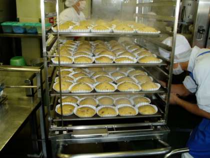 きなこ蒸しパンが蒸しあがり、給食室の中からきなこの香ばしいかおりがしてきました。青のエプロンは調理担当者の目印です。調理完成の確認のため、中心温度を3か所測っています。