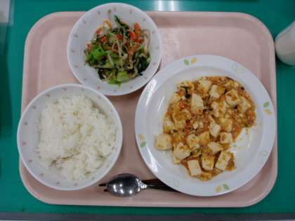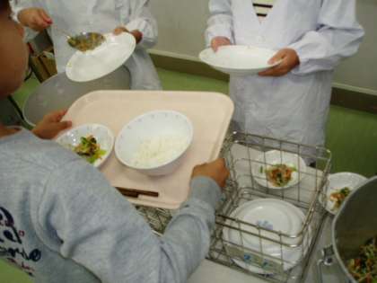 麻婆豆腐の豚ひき肉の量は控えて、大豆のみじん切りを加えました。豚ひき肉だけでつくった麻婆豆腐に比べて低脂肪・高たんぱく質のメニューになっています。給食当番の児童が丁寧に盛りつけています。