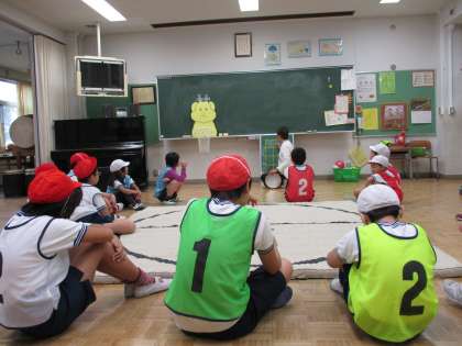 1時間目は、学習室で体育をしました。今日は、ボール送りリレーとミニゴールへのシュートを合わせた室内でできるボール運動をしました。4つのチームで「作戦を立て工夫して取り組むこと」というめあては、サッカー型のシュートゲームの時と同じです。チームで力を合わせてボール運動に取り組むことができました。