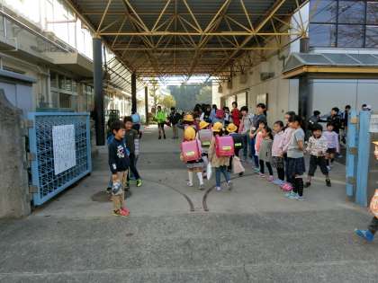 正門では縦割り班1班が、6年生を中心に元気な「おはようございます!」の声かけをしていました。秋晴れの気持ちのよい天候の中、子どもたちは登校してきました。