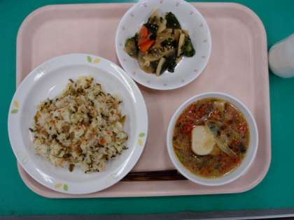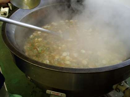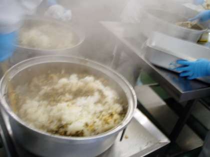 ごはんが炊き上がり、高菜ごはんの具を混ぜています。烏山小学校のごはん食給食で炊いているごはんの量は毎食約100kgです。トックとは韓国版お雑煮です。歯切れのよいトックをじっくり煮込みました。