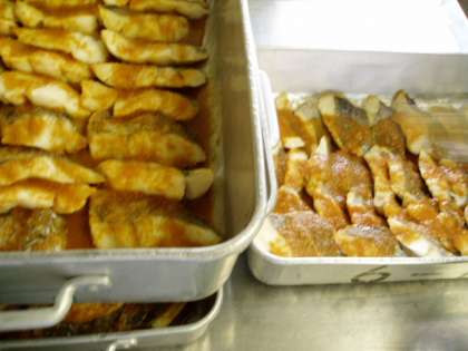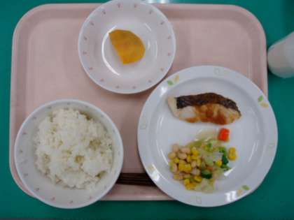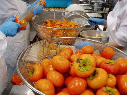 本日のくだものは柿です。甘く熟した旬の柿を1個ずつ丁寧に皮をむいています。しょうゆ味ベースのバーベキューソースを焼いたホキにかけました。ミキサーにかけたたまねぎのやさしい甘みがおいしいソースです。