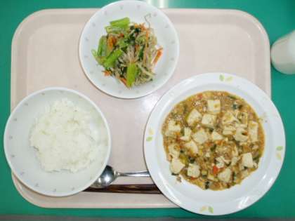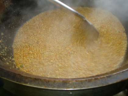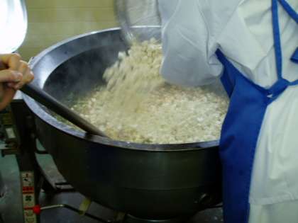 麻婆豆腐のあんができました。豚ひき肉とねぎだけではなく、大豆・にんじん・しいたけなどがみじん切りにされて入っています。隣の釜でゆでた豆腐をあんに混ぜて、麻婆豆腐の完成です。