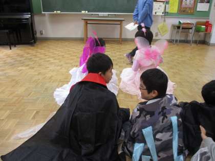 今日は、体育館で学芸会の2日目、保護者鑑賞日でした。つくし学級は、プログラム4番、9時55分からの出演予定でした。着替えを済ませ、みんなで「がんばるぞ!」と声を出し、心を一つにして体育館へ向かいました。6年生を中心に創ってきた「にじいろのとり」の劇をみんなで演じることができ、たくさんの拍手をいただきました。