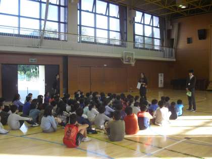 来賓・保護者鑑賞日には、子どもたちは自分たちの演目以外の時間、教室で学習をしていました。予定時刻が近くなると、会場である体育館の横を静かに通り、会場入りします。