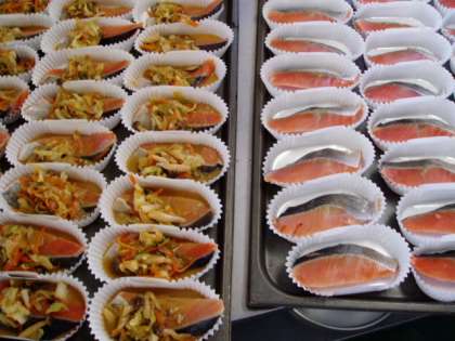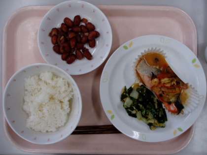 魚のチャンチャン焼きを調理中です。並べた旬の秋鮭にみそ味の具をかけたら、オーブンでしっかり焼きます。うずら豆はじっくり3時間かけて煮ました。本日から2学期ランチルーム給食が始まります。充実した食育の時間になるように、ランチルーム給食では栄養士の話を聞く時間や旬のくだものが1品追加されています。