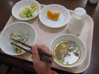今日はランチルーム給食でした。デザートは何なのか、みんなとても楽しみにしていました。栄養士の先生から、「他の学級はうさぎりんごですが、今日のサラダにりんごが入っているので、みなさんは特別に『はやか』という柑橘系の果物ですよ。」と説明があり、みんな喜んでいました。「はやか」はみかんとポンカンをかけ合わせた果物だそうです。甘くておいしかったです。またお箸の持ち方について栄養士の先生からお話があり、お箸の持ち方について確認しました。みんなでおいしく給食を食べることができてよかったです。