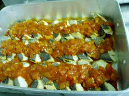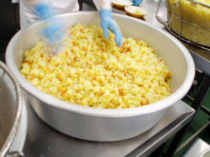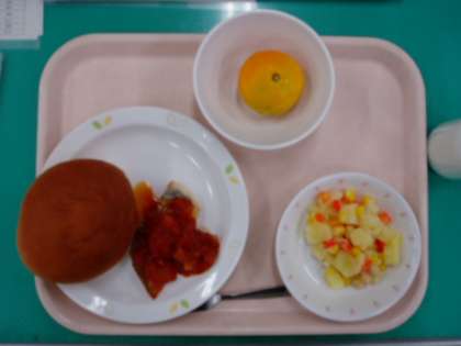 ホキをオーブンで焼き、手作りトマトソースをたっぷりかけています。パンに合う1品です。ポテまめサラダはサイコロ状のじゃがいも・野菜と大豆のサラダです。りんご入りのドレッシングが、食べにくい大豆を食べやすくしています。
