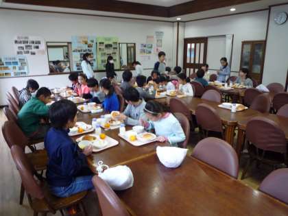 今日は、5年3組がランチルーム給食でした。デザートにはうさぎの形に切ったりんごが出ました。栄養士の先生から、「高学年はエネルギーをたくさん消費するから、しっかりと給食を食べましょう。」とお話がありました。