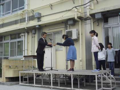 校長先生からは、学芸会の振り返りのお話、「美しい日本語週間」についてのお話と、「税を考える週間」小学生書道作品展の表彰がありました。