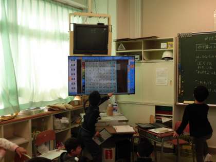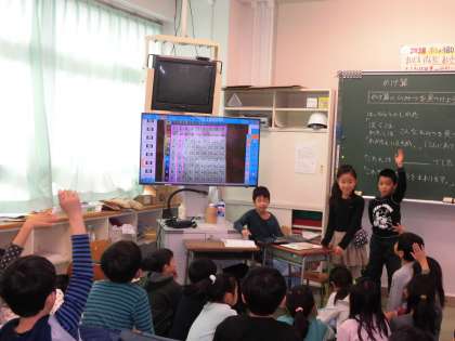 かけ算九九の表から発見したことをタブレット端末と大型テレビモニタを使用し、みんなの前で発表しました。友達の見付けたきまりを聞いた子は拍手をしたり、驚きの声を上げたりしながら聞いていました。友達の前で発表できた子もとても満足そうでした。