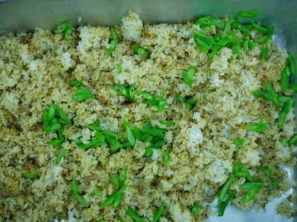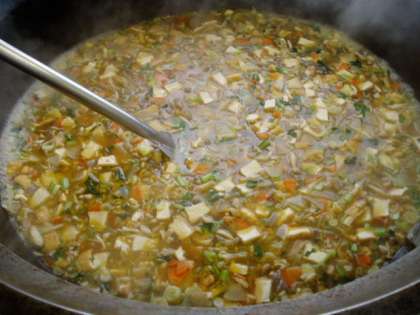 八丈島でとれた新鮮なむろあじを使い、そぼろごはんにしました。魚のくさみがないので、とりそぼろと間違えててしまう献立です。たっぷり生揚げを使った五目汁が完成しました。雪が降る寒い日は、温かい汁物が一層おいしく感じます。