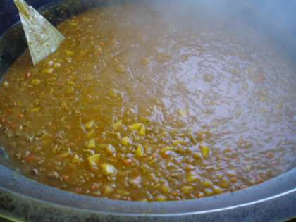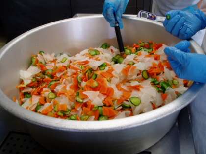 野菜をあえる前に野菜の温度を測り、冷却されているかをチェックしています。人気献立のポークカレーもできあがりました。ルーを入れてからじっくり煮込むので、コクがあるおいしいカレーになります。